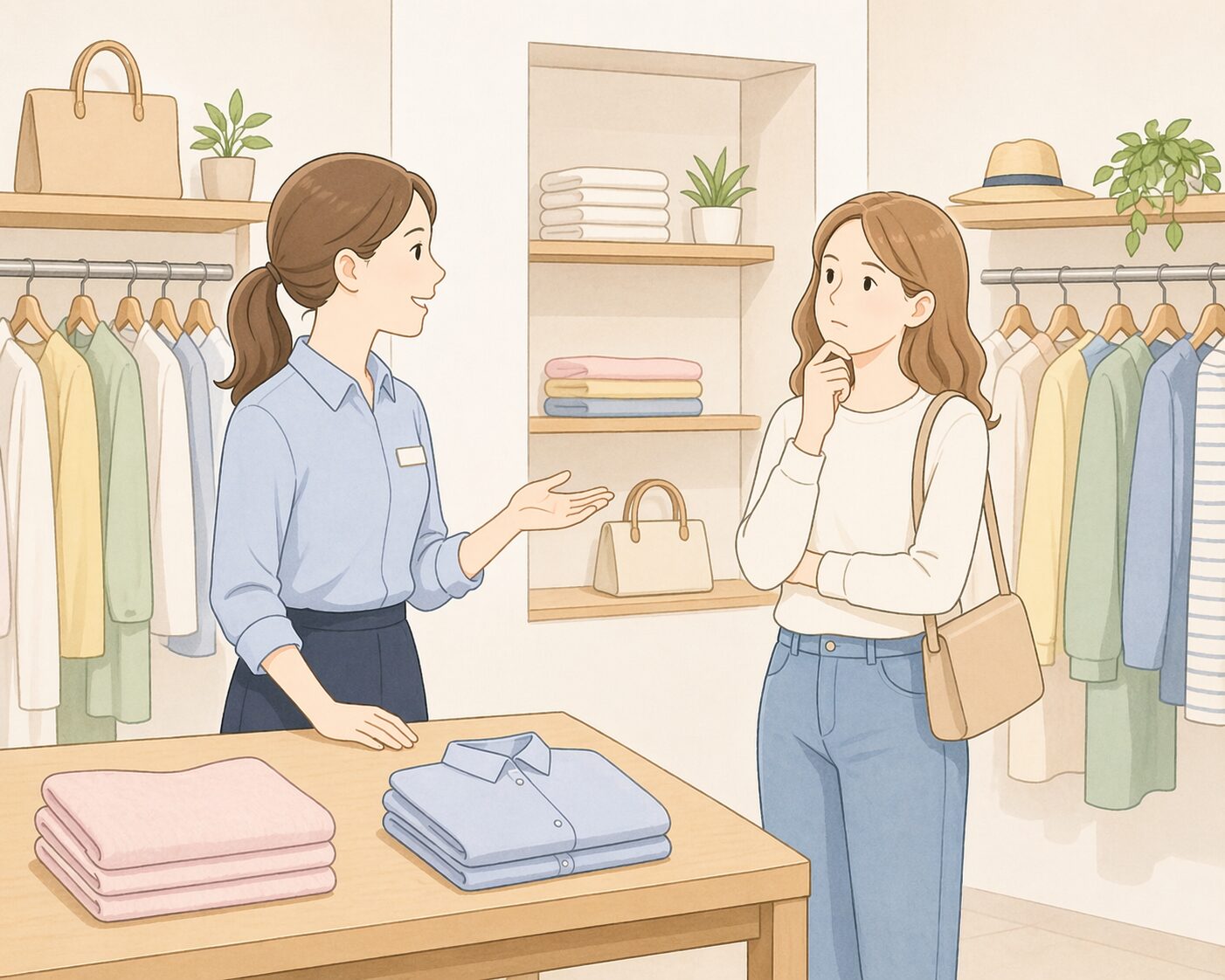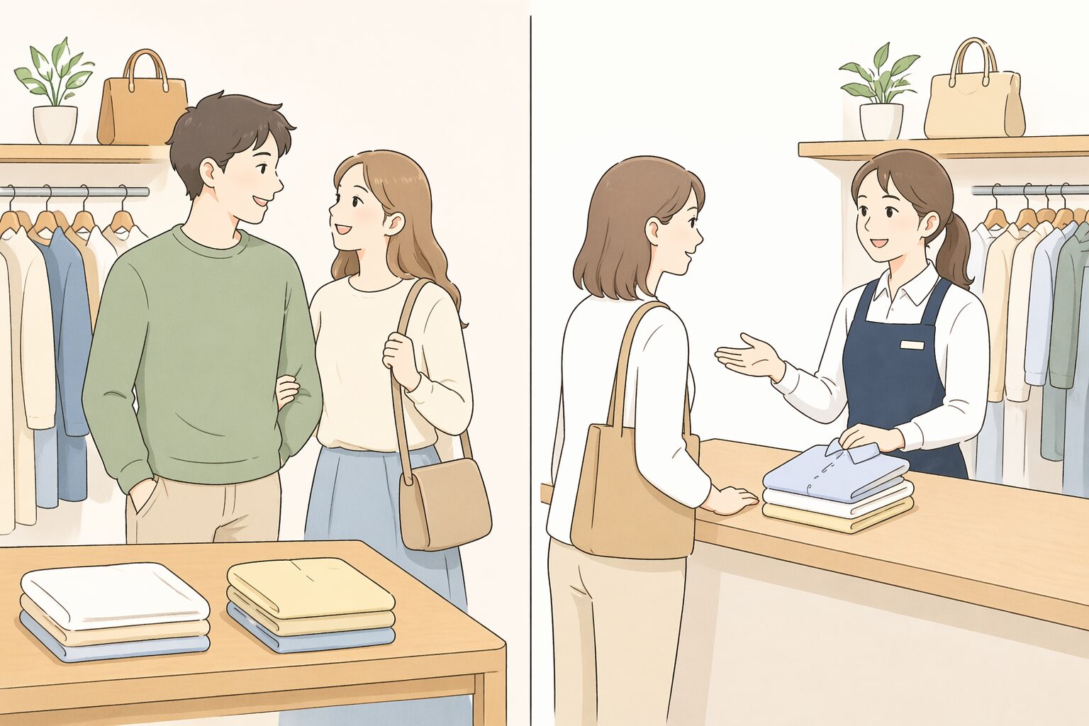 • 店員さんがお客様に使う表現は「何かお探しですか?」や「いかがですか?」が自然