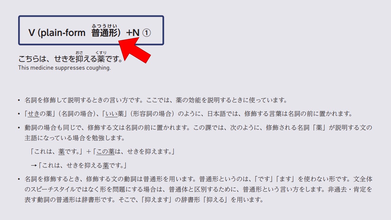 動詞で名詞を修飾するときには、【動詞の普通形+名詞】の形を使うと説明しています。