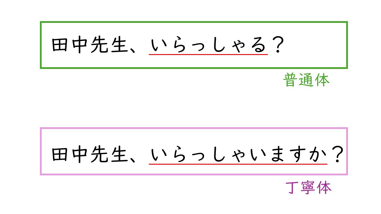 「田中先生、いらっしゃいますか?」は「いらっしゃいます」という尊敬語があるから丁寧体ですか?