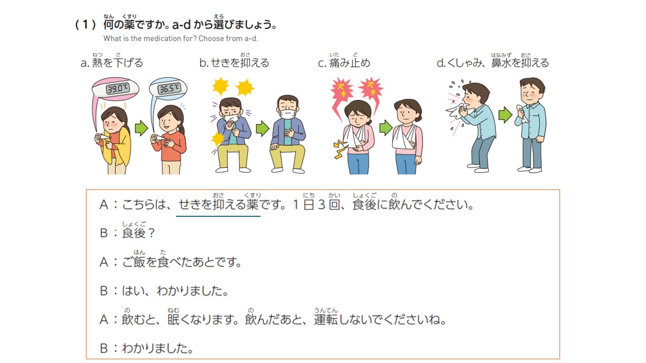 薬局で薬の説明を受けている場面で、「咳を抑える薬です」のような名詞修飾がでてきます。
