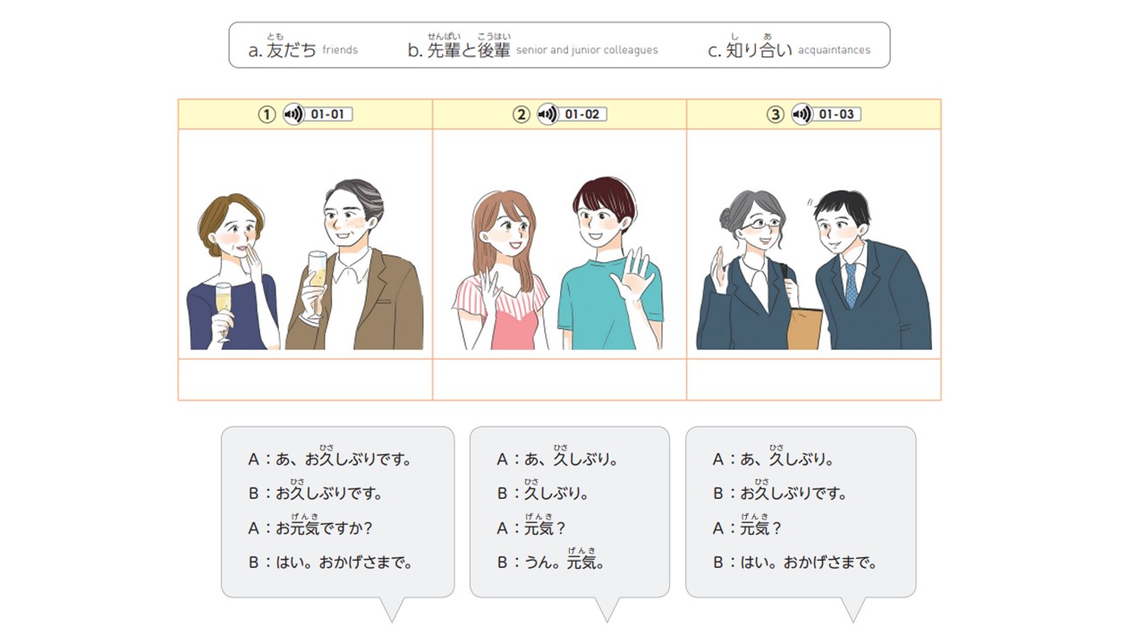 『いろどり 初級1 第1課』では、久しぶりに会った人とのあいさつする場面が出てきます。