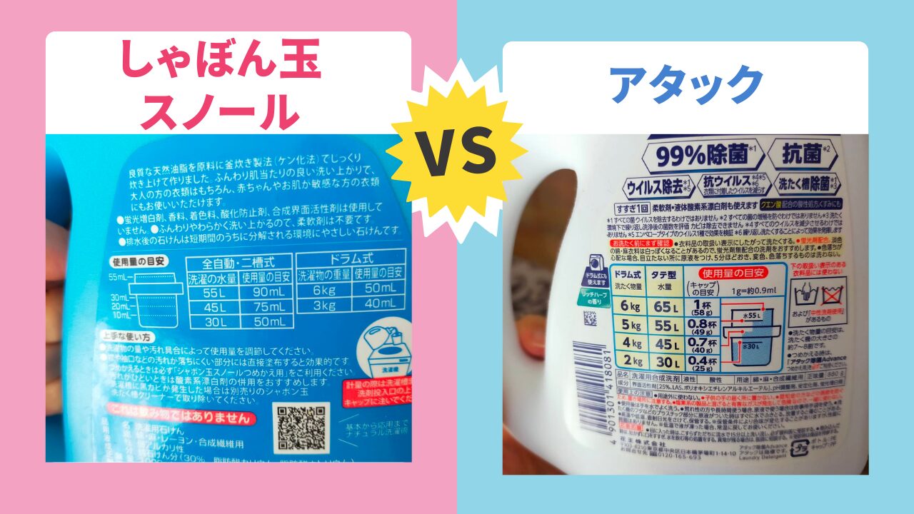 また値段も、しゃぼん玉スノールが1mLで1000円ぐらい、アタックが720mLで500円ぐらいです。